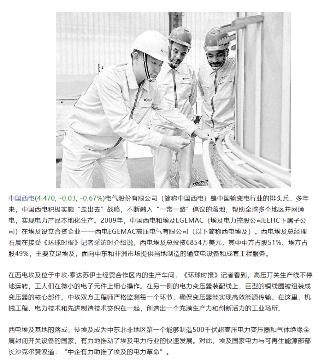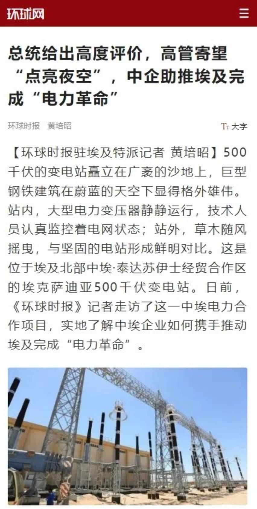 习近平总书记指出:“要推动共建“一带一路”高质量发展,加快全球发展倡议落地,培育全球发展新动能,构建全球发展共同体。”中国西电集团、中国西电深入贯彻中央决策部署,全力推动“一带一路”的高质量发展,带动中国制造、技术、标准和服务共同“走出去”,融入世界,造福世界。环球时报聚焦中国西电帮助埃及电力装备产业发展和壮大,推动埃及完成“电力革命”做了专题报道。