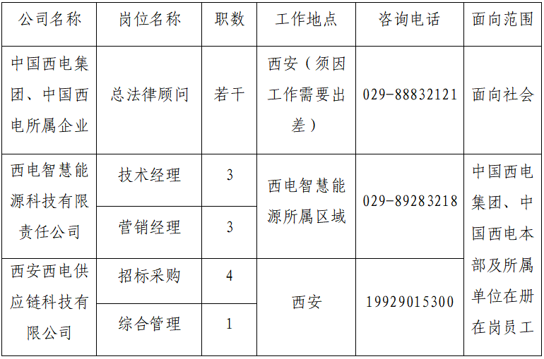 1.面向公司内部招聘的岗位,应聘人员应为中国西电集团、中国西电本部及所属单位在册在岗员工;