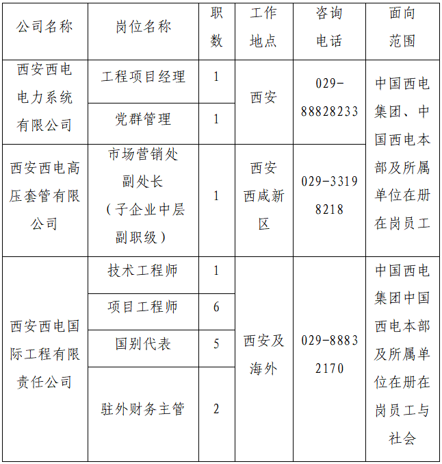 1.面向公司内部招聘的岗位,应聘人员应为中国西电集团、中国西电及所属单位在册在岗员工;